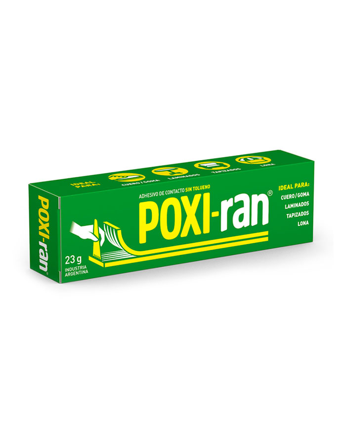 Poxi-ran es el adhesivo de contacto recomendado para pegar materiales flexibles como cuero, goma, lona y también madera y laminados.
