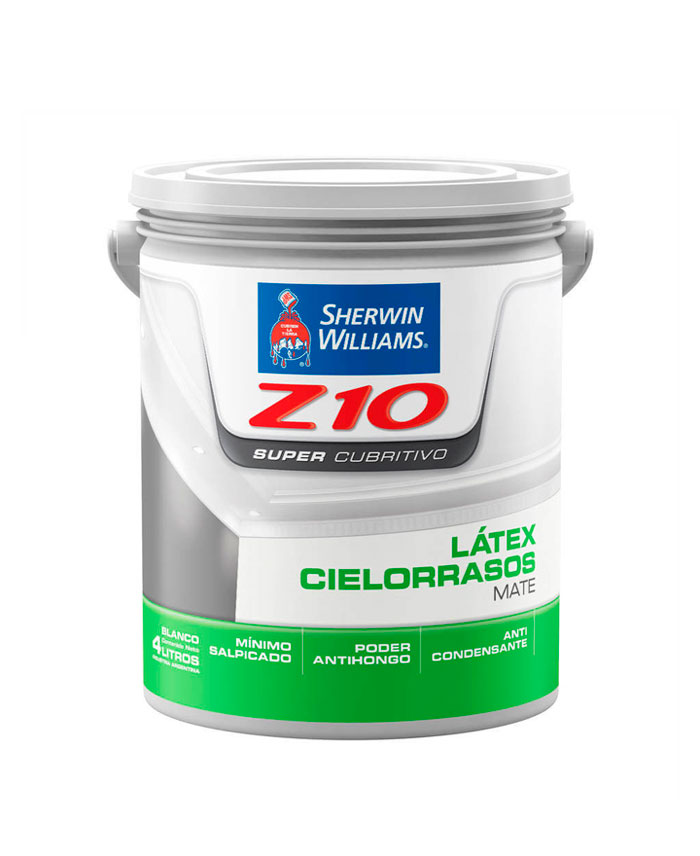 Z10 SUPER CUBRITIVO LÁTEX CIELORRASOS es una pintura especialmente formulada con resinas en dispersión acuosa y pigmentos de primera calidad para lograr un acabado de impecable blancura, excelente adherencia y resistencia a los hongos. Su alta porosidad evita los problemas de condensación típicos de las superficies selladas.